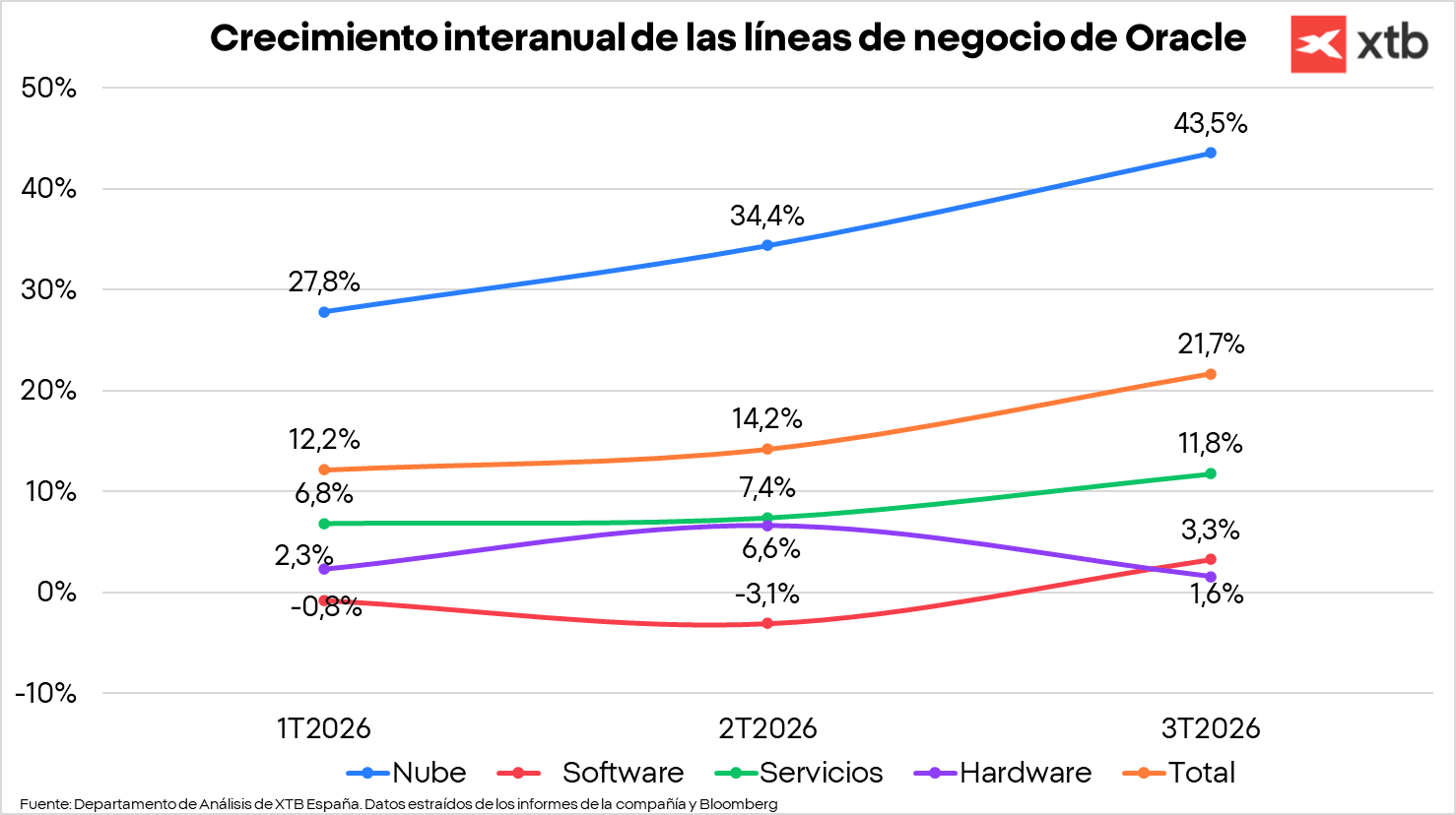 - Nube inteligente: se trata de servicios de nube inteligente, que van desde el almacenamiento hasta la oferta de software como servicio dentro del ecosistema de nube de Oracle. El problema que enfrenta Oracle en esta área es que el crecimiento está viniendo mayormente de la demanda de nube como infraestructura (almacenamiento, el cual tiene menor margen), mientras que la nube como software está creciendo alrededor de un 10% interanual. En concreto, en el último trimestre el 83% del crecimiento de la nube vino por la demanda de almacenamiento. Esta línea representa algo más de la mitad de los ingresos de la empresa.