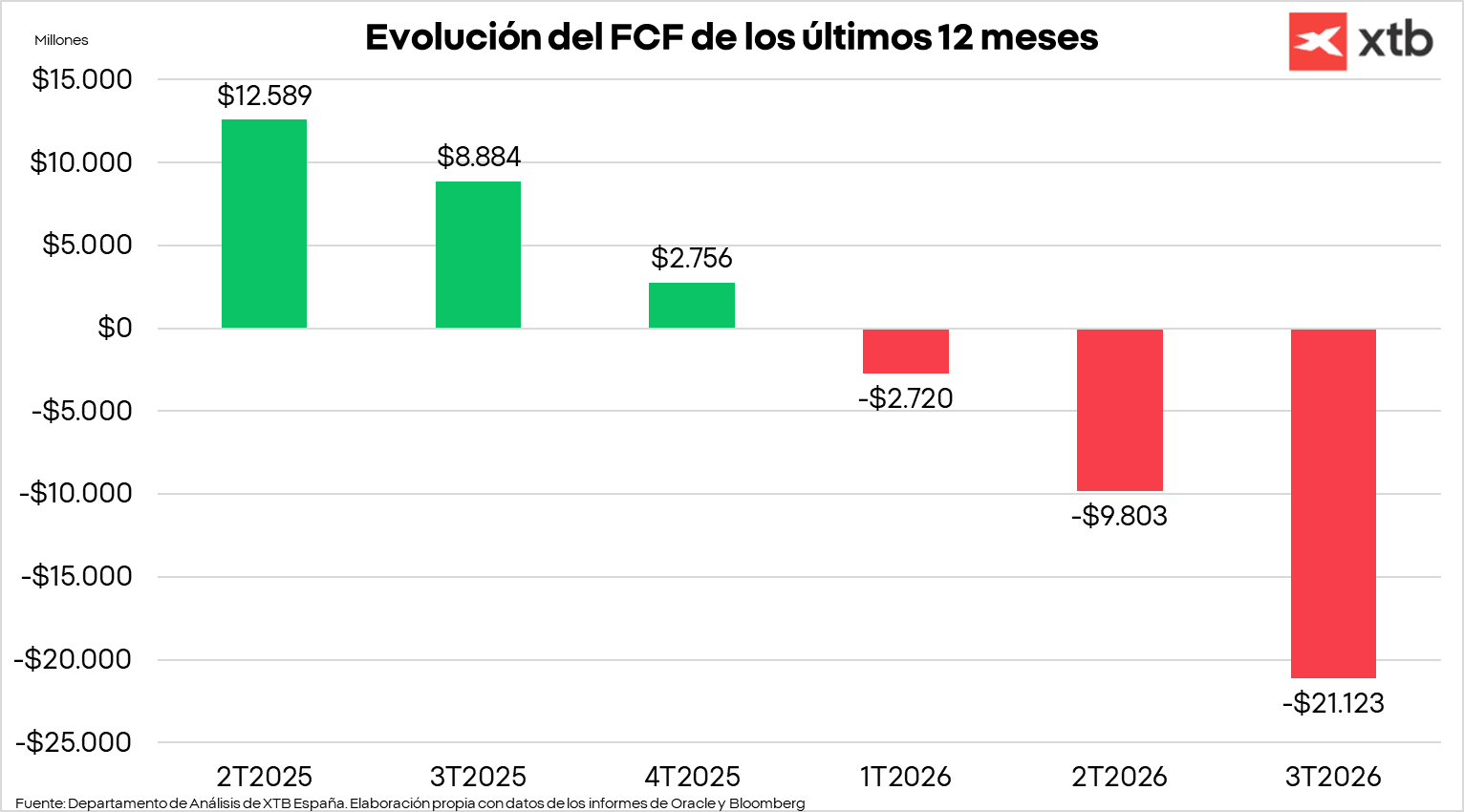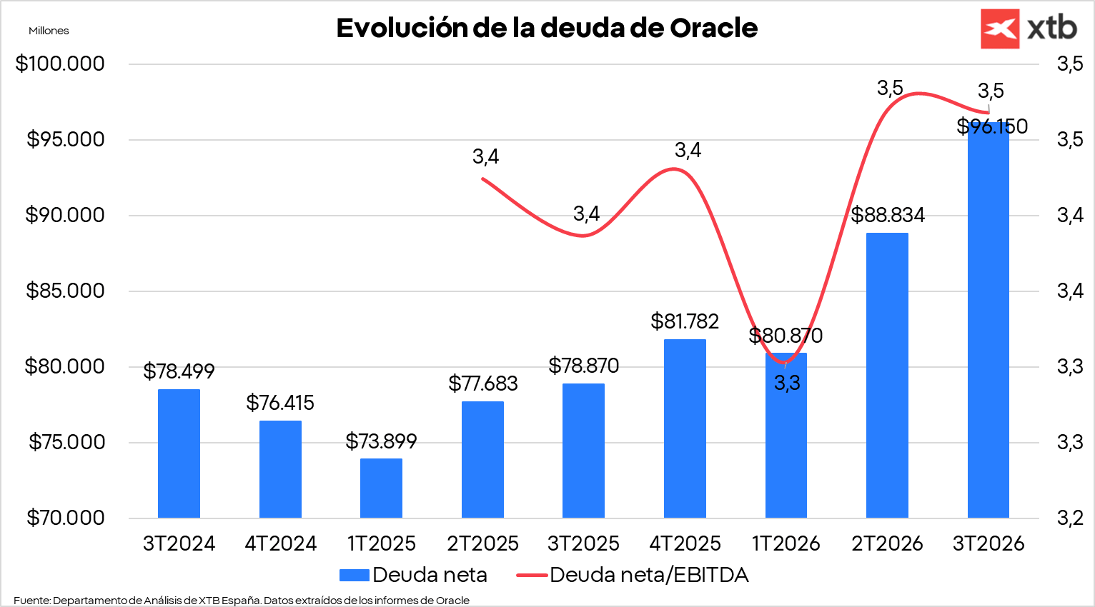 Por tanto, si este es negativo, la empresa no tiene más remedio que pedir deuda para financiar dichas inversiones. Esto está llevando al endeudamiento de Oracle a niveles que pueden empezar a ser preocupantes.