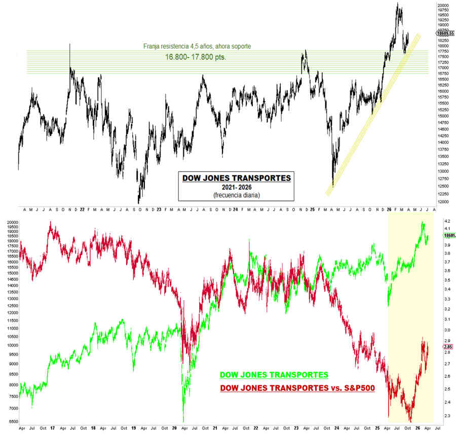 El DOW Transportes agrupa a las principales compañías estadounidenses de transporte sigue mostrando un momentum excepcional. En las últimas correcciones ha encontrado un sólido soporte en la franja que, durante los últimos cuatro años y medio, representaba una importante zona de máximos.