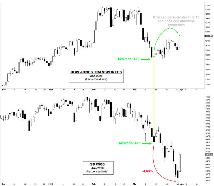 Desde esa fecha, el DOW JONES TRANSPORTES ha construido un rebote con máximos crecientes, mientras que el SP500 ha caído un 4,6%, generando una clara divergencia alcista a favor del Dow.