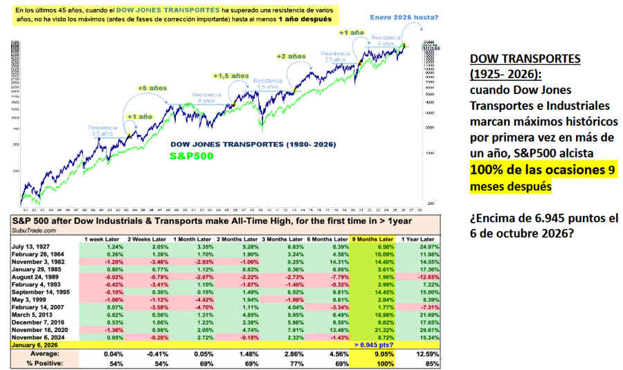 Las superaciones de máximos de varios años en el Dow Jones Transportes han venido generando consecuencias alcistas posteriores para el propio índice, las cuales tienen un impacto positivo en el SP500 gracias a su correlación.