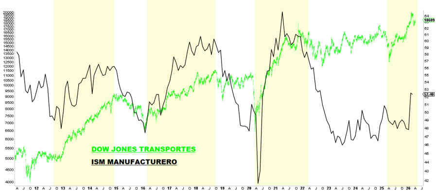 El mejor tono del Dow Jones Transportes ha venido de la mano de una mejora del ciclo económico, como podemos comprobar en el gráfico inferior, donde se compara al índice con la evolución del indicador de actividad económica ISM MANUFACTURERO.
