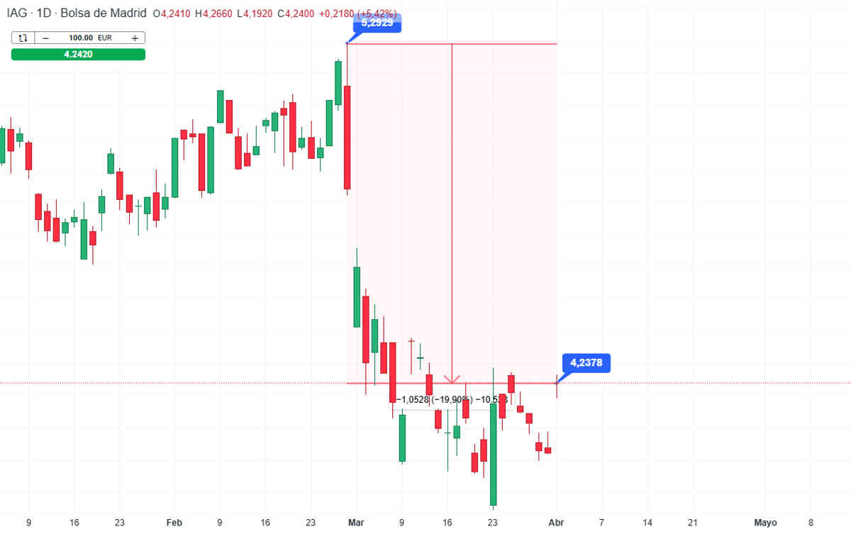 En el caso concreto de IAG, la acción acumulaba una caída cercana al 20% desde el 27 de febrero, coincidiendo con el inicio del conflicto. Aun así, ha mostrado más resistencia que otras aerolíneas europeas.