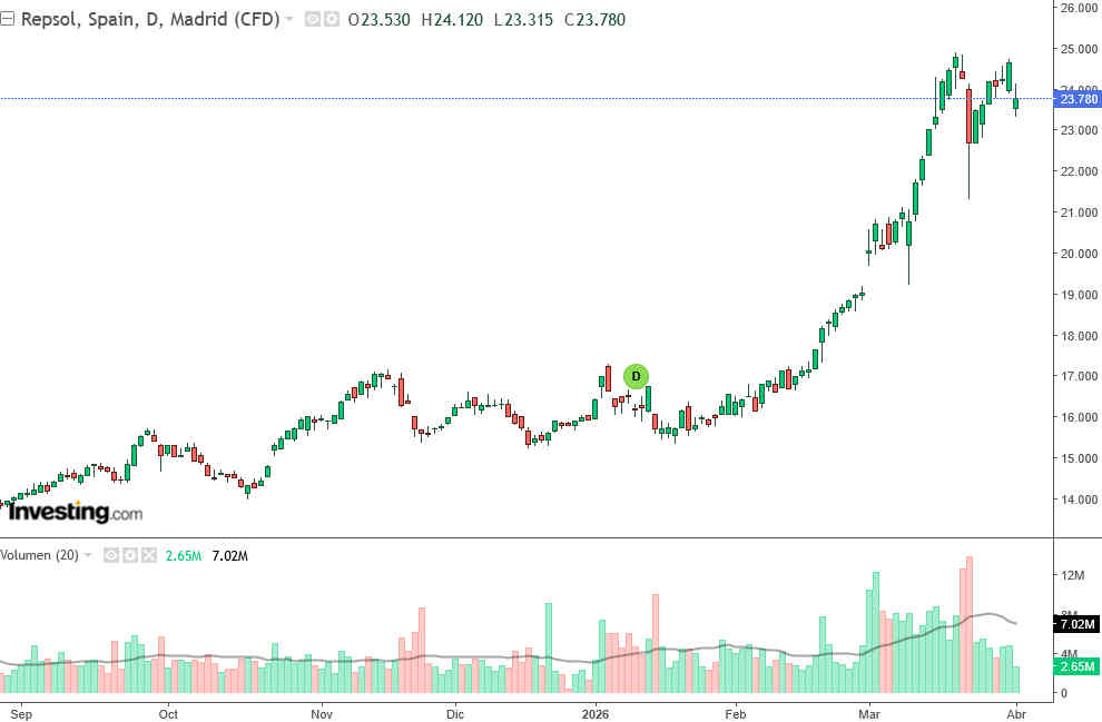 Desde el punto de vista técnico, la acción ha perdido el soporte de los 24,20 euros. Si la presión bajista continúa y el petróleo no logra estabilizarse por encima de los 100 dólares, el siguiente nivel de control para Repsol se sitúa en los 23,30 euros, mínimo marcado durante la sesión de hoy.