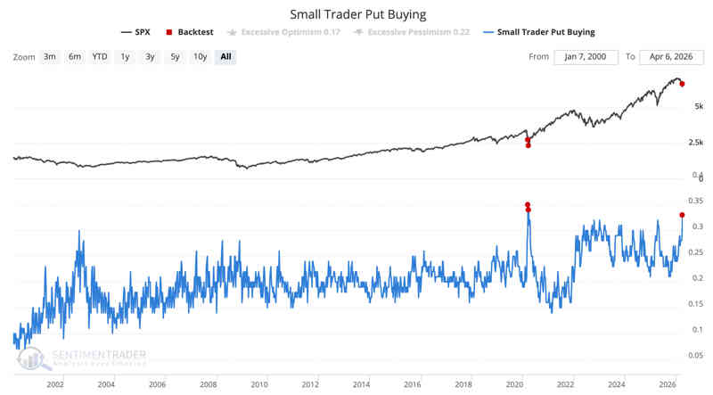 También los inversores de carácter más especulativo han entrado en modo pánico y actuado en desbandada, según se desprende de las compras de Opciones PUT (apuestas bajistas y/o coberturas de cartera) subiendo en vertical en las últimas 3 semanas hasta niveles raramente vistos, hace un año con motivo del terror causado por los aranceles aunque fue inferior al actual, el anterior fue en pleno Covid.