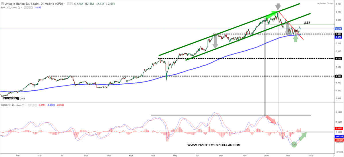 Resistencias:R1 (2,60 € – 2,64 €): Zona crítica donde el precio se ha «atragantado» recientemente; coincide con el consenso de precio objetivo de algunos analistas.