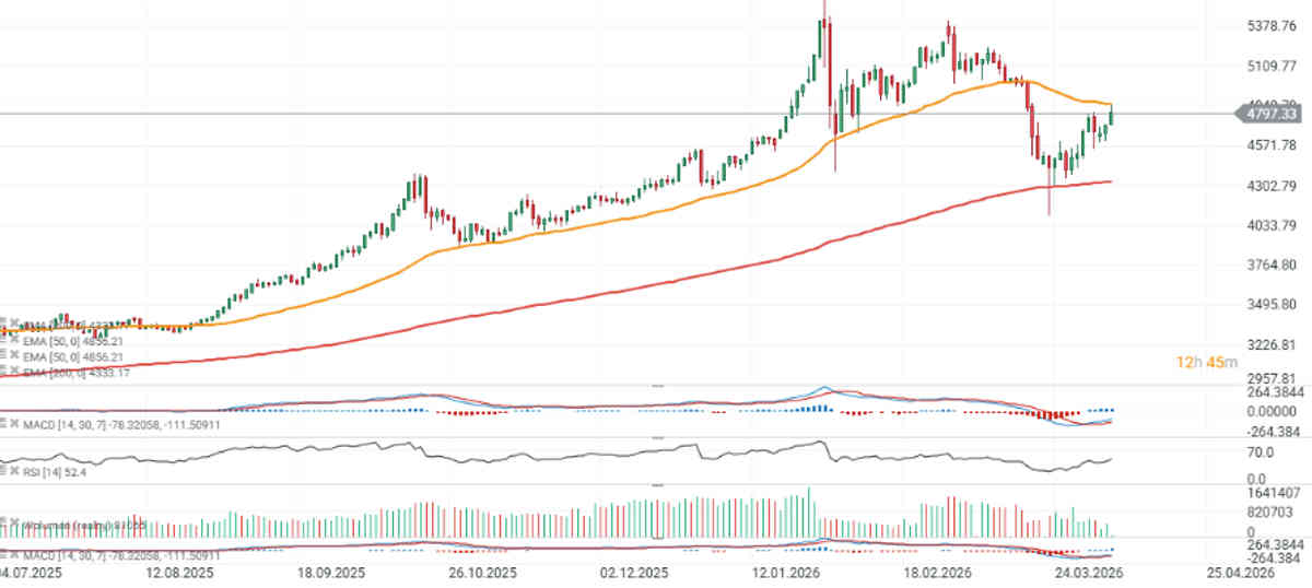 El oro retrocedió tras alcanzar los 4.850 dólares (la EMA de 50 días, línea naranja), y una ruptura por encima de ese nivel parece ahora el desafío clave para los alcistas. Cabe destacar que el precio ha reaccionado positivamente en los últimos días, volviendo a situarse por encima de la EMA de 200 días (línea roja) e iniciando un nuevo impulso alcista.