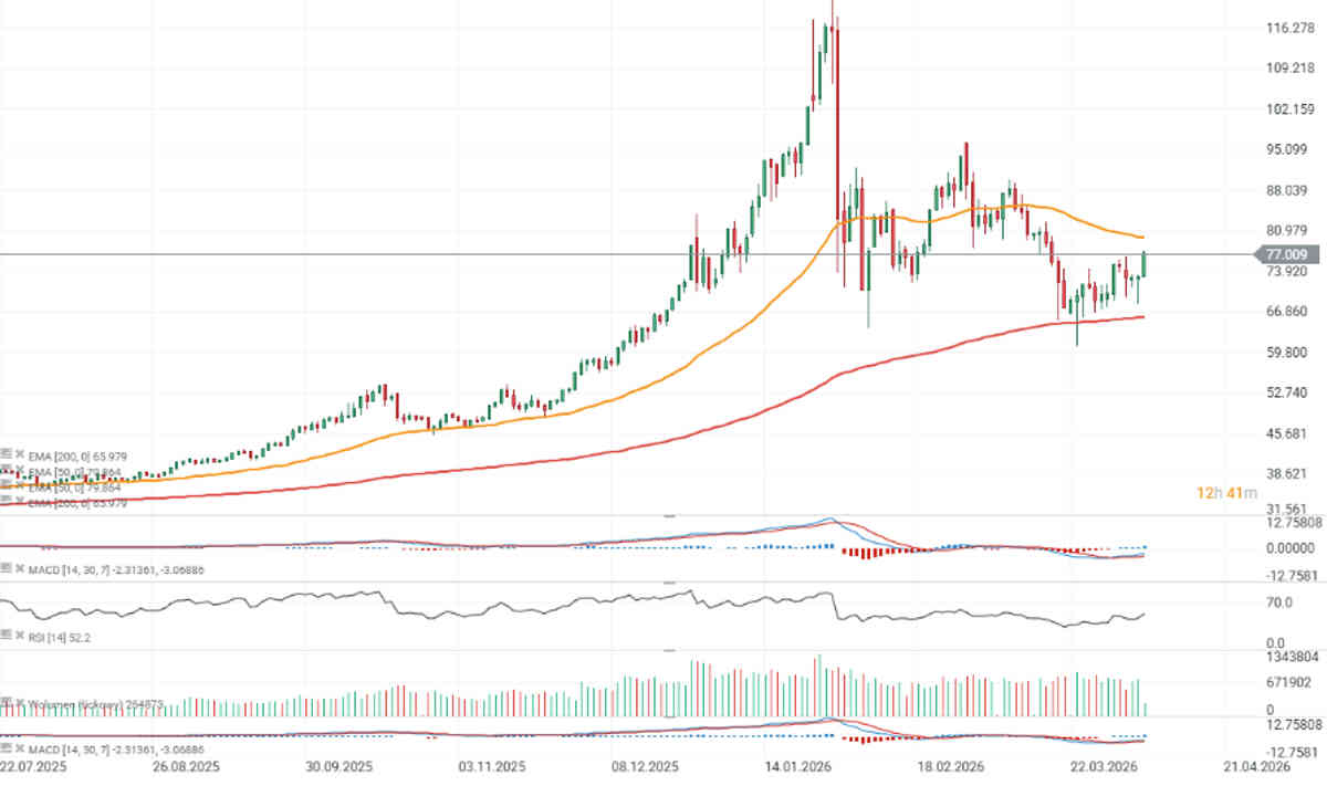 La plata cotiza hoy en su nivel más alto desde el 18 de marzo, aunque sigue muy por debajo de los niveles de finales de enero, cuando alcanzó casi 120 dólares por onza. Al igual que en el oro, la zona alrededor de 65 dólares parece actualmente un soporte relevante para la plata.