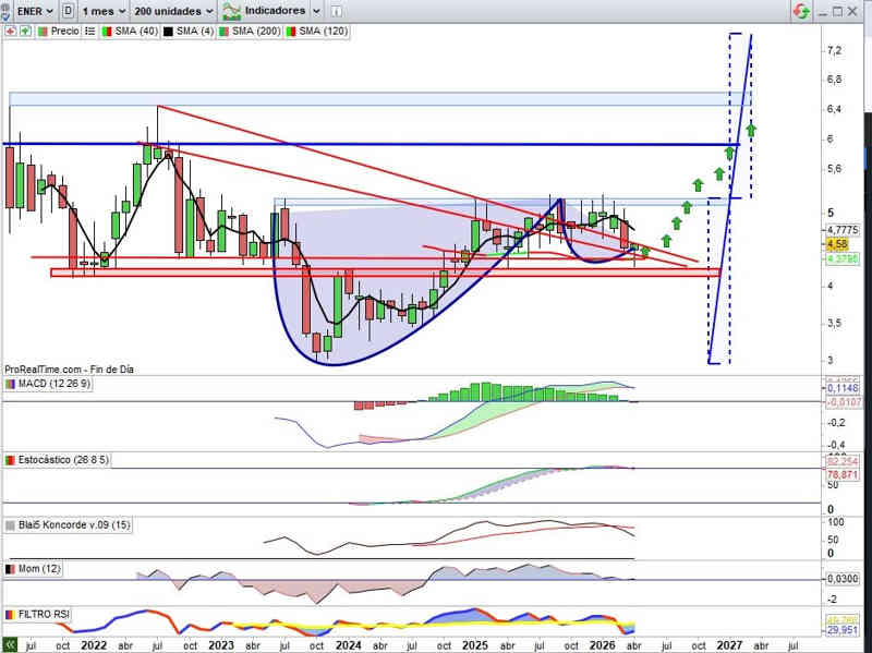 4,58€ +3,62% Ayer, no la vamos a ver en Gráfico Semanal, la vamos a ver en esta referencia del Gráfico Mensual, que es más relevante sobre lo comentado de este valor en la zona actual y lo que supone de cara a la fase de posicionamiento del valor esperando la reactivación alcista en forma y estructura de muy alto potencial sobre lo ya reflejado del valor en tesis de inversión que seguiremos desarrollando, porque vienen aspectos a confirmar muy interesantes.