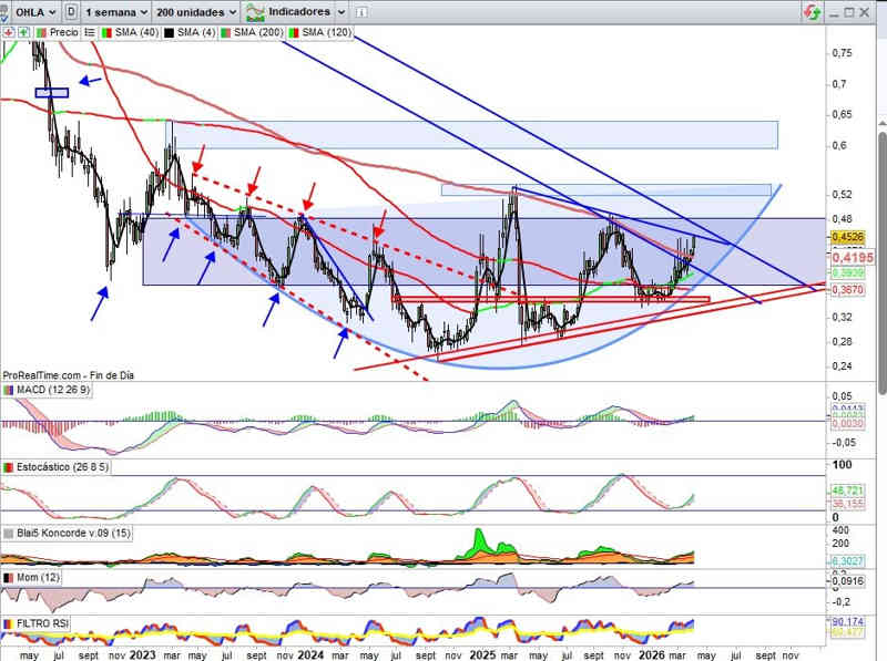 0,4526€, +6% Ayer, sesión en la que vuelve a gestionar la resistencia clave en corto plazo, aunque el tiempo lo pone el mercado, y estructuralmente lo más importante, haciéndolo desde soporte clave ya referenciado, ahora con la importante Media Móvil 200 perforada, por 0,4190€ ahora como soporte que mantendría la señal cambio de tendencia más relevante del oscilador en el campo precio. Se frena ayer ante la directriz bajista de medio plazo, ahora en 0,46€, clave para atacar la más relevante del lado técnico de la segunda directriz bajista que en perforación confirmaría cambo de tendencia significativo y señal proyección alcista de mayor potencial.