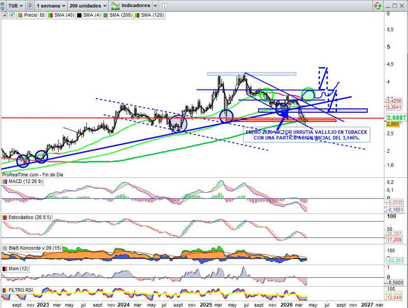 Sobre Gráfico Mensual, todo está aquí, sobre lo indicado en anteriores actualizaciones con la vuelta a este valor que ahora confirmando cambios de tendencia, activaría un potencial mayor al reflejado ya en operativa anterior en su tendencia bajista. En clave doble directriz soporte y doble directriz resistencia que, ahora de esta segunda parte, tiene muy bien posicionado el precio de cotización para gestión del obstáculo principal, la segunda directriz bajista, clave para esa confirmación cambio de tendencia y a partir de ese momento el valor tendría que activar mayor capital inversor que espera a estas señales.
