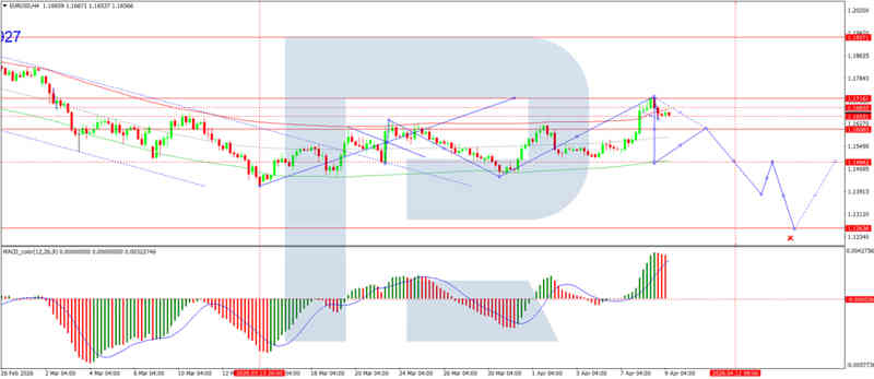 En el gráfico de 4h del EURUSD, el mercado está formando un rango de consolidación alrededor de 1.1683. Se espera una onda bajista, con una continuación hacia 1.1606 como objetivo local. Posteriormente, se anticipa un movimiento al alza de regreso a 1.1683. Técnicamente, este escenario está confirmado por el indicador MACD, con su línea de señal por encima de cero pero apuntando firmemente hacia abajo, reflejando un impulso bajista continuo y el potencial de que la tendencia a la baja persista.