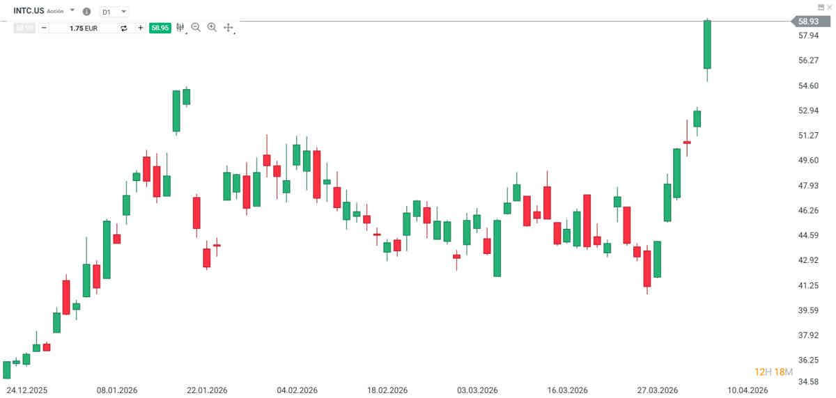 Las acciones de Intel están firmando un comienzo de año excepcional. La compañía acumula una de las mayores revalorizaciones dentro del sector hardware, con un avance del 56,1% desde enero y una subida intradía del 11,4% en la sesión de ayer.