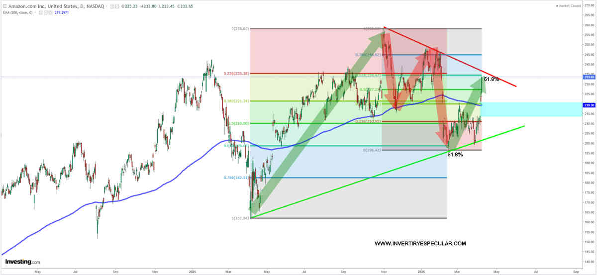 Pues si, con un 11.38% a cierre de ayer Amazon fue la mejor acción de tal selectivo. Antes del conflicto había ya terminado una abc como respuesta correctiva a la subida de 161 a 258 dólares y para mayor emisión de mayor orden técnico tal abc fue justo al 61,8%.