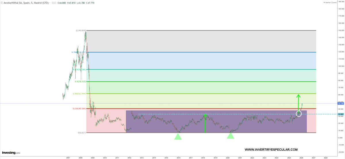 Con un 11.11% ArcelorMittal (MTS:MC) destaca en nuestro selectivo en las ultimas sesiones. Pese a que algunas grandes firmas daban por agotado o con poco recorrido al valor nosotros les dimos de objetivo 61 euros tanto por figura como por Fibonacci, nuestro gráfico del 3 de febrero sin sombra de saber lo que vendría después al mes siguiente: