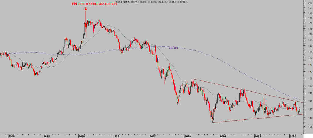 El T-Bond (bono del Tesoro a 30 años) se mueve actualmente en zona de mínimos de los últimos años, en niveles que coinciden con el suelo de una figura técnica bien definida y de gran relevancia. Esta configuración técnica se caracteriza por unos límites o directrices muy claras (soporte y resistencia) que han sido respetadas con una precisión notable cada vez que el precio los ha alcanzado en los últimos 3 años