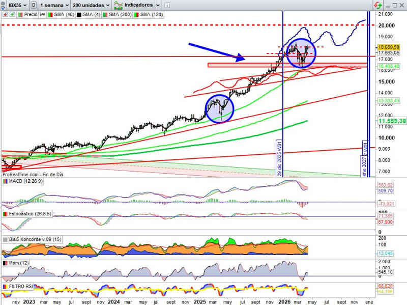 Sobre Gráfico Semanal que mantiene en zona de máximos históricos de momento la sugerencia técnica del lateral planteado entre los 18.100 Puntos y la zona en rango 17.500 / 17.300 Puntos desde la que terminar de desarrollar un posible Hombro Cabeza Hombro Invertido que suponga forma representativa de continuidad alcista estructural para proyectarse posteriormente a nuevos máximos históricos, (no imprescindible, por supuesto, esta forma para esa sugerencia técnica de continuidad alcista). Estas son las referencias resistencias / soportes clave en el corto plazo. Indicadores en señal compra y en favor de la tendencia. De momento el boceto planteado a principios de año se mantiene inalterable, todo en orden técnico para seguir subiendo.