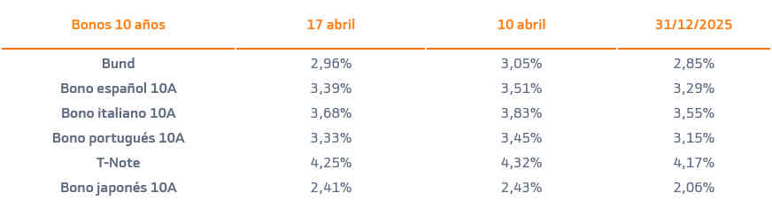 En macro, esta semana tendremos ZEW e IFO en Alemania y los PMIs de la UEM y de EE.UU. Además, se publica IPC de marzo en Reino Unido y Japón, donde no se esperan repuntes significativos. Así, esta semana la volatilidad será de nuevo la nota dominante en función de las noticias que vengan del frente. Reiteramos nuestro posicionamiento en los tramos cortos/medios de la curva, donde vemos mayor atractivo y riesgo más moderado.