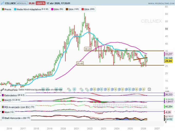 La pérdida de estos, podría hacer que nuevamente volviera a buscar valores soportes en torno a la cota de los 23 y posteriormente los 21€. Resistencia: 35,20 y 37,60€.