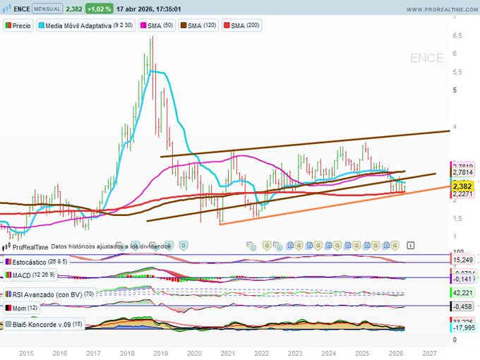 Velas mensuales. Respeta la zona de soporte que oscila aproximadamente en 2,22€, coincidiendo tanto con la SMA200 como con la alcista de l/p.
