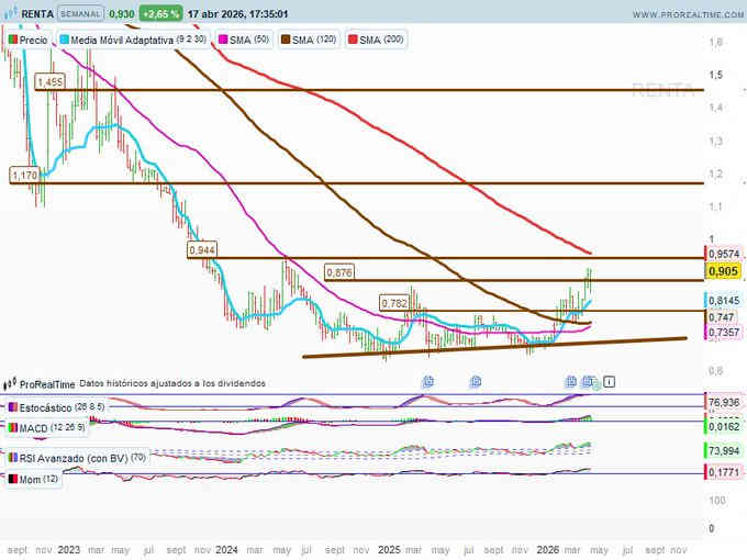 Velas semanales. Supera cierres sobre la cota de resistencia de los 0,87€ y llega a alcanzar la siguiente zona de resistencia marcada en los 0,94€.