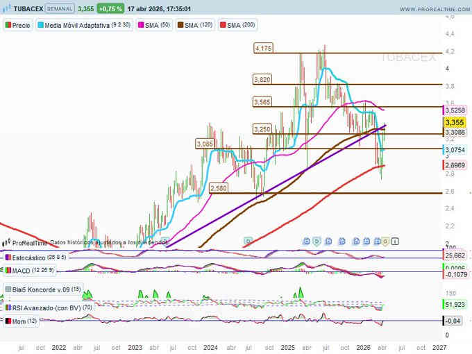 Las próximas zonas de resistencia están alrededor de los 3,56€ y posteriormente los 3,80€. La zona de soporte situada sobre dicha media de 200, los 2,90€.