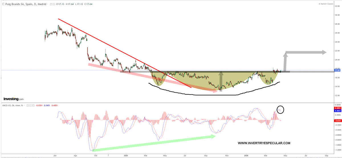 Puig Brands (PUI:MC) mantiene viva su clara figura de suelo con su respectiva divergencia alcista marcando un objetivo para este año de 22 euros, aunque habría que perdonarle si antes de seguir ascendiendo decide tapar el gap que tiene por abajo pendiente, ahí sería para entrar para quienes no la tienen por ejemplo.