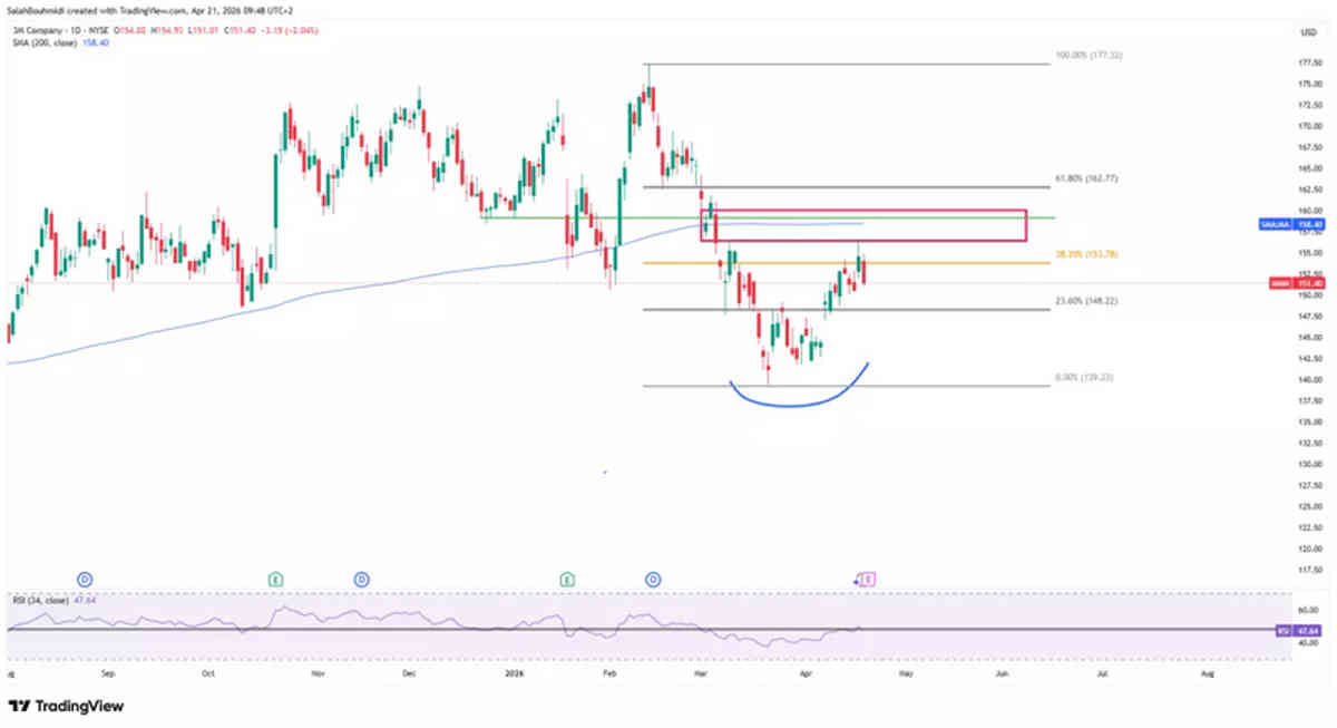 3M en gráfico diario: la zona entre 153,78 y 159,20 dólares es ahora decisiva