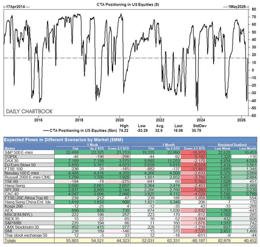 De acuerdo con analistas de Goldman Sachs, «Estimamos que los CTAs compraron 44.000 millones de dólares en acciones estadounidenses la semana pasada y 84.000 millones de dólares a nivel global. Para la próxima semana, estimamos que los CTAs seguirán comprando acciones tanto en Estados Unidos como a nivel global en todos los escenarios».