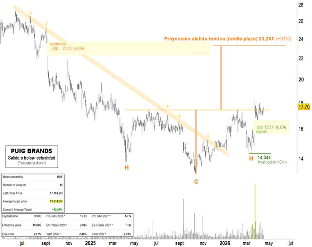 En las últimas semanas, las conversaciones de posible fusión con Estée Lauder han propiciado la consecución de un patrón de cambio de tendencia, con proyección alcista teórica en 23,25 euros, un 31% por encima.