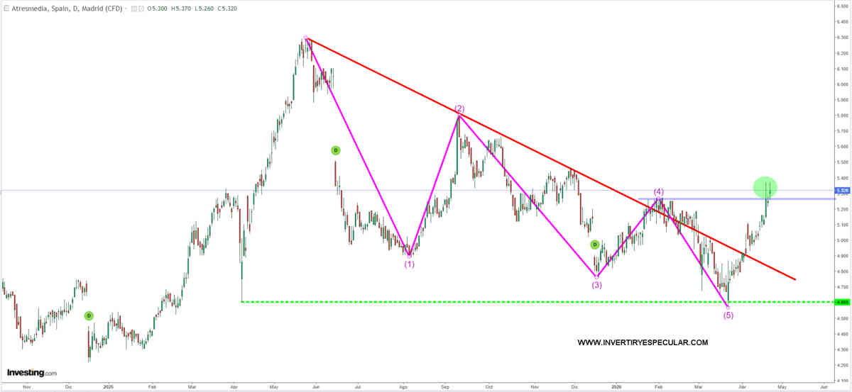 La acción superando 5.26 euros está ahora en máximos anuales pero hizo anteriormente una muy fea caída en cinco a total contra del mercado y lo hizo desde mayo pasado hasta marzo, al punto que tocó mínimos de abril en total vuelta bajista donde la media del mercado lo hizo a la EMA 200.