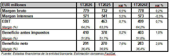 Por su parte, el margen bruto, que agrupa la totalidad de los ingresos, se situó en EUR 779 millones, un 6,5% interanual más en el 1T2026 (+0,2%; consenso analistas), gracias al buen comportamiento de las comisiones, en su mayor parte procedentes de servicios transaccionales o de asesoramiento y gestión de activos.
