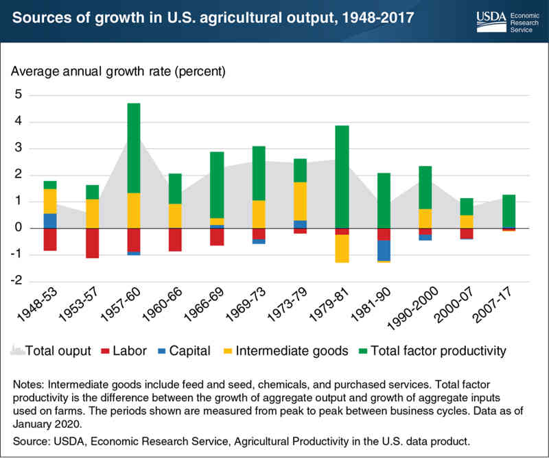 Existen ejemplos históricos de esta dinámica, siendo el más destacado el sector agrícola. Según el Servicio de Investigación Económica del Departamento de Agricultura de Estados Unidos (USDA), la producción total de las granjas estadounidenses casi se triplicó entre 1948 y 2017, mientras que el trabajo agrícola disminuyó un 76% y la superficie dedicada a la agricultura se redujo en más del 25%. Esta divergencia pone de manifiesto que el crecimiento de la producción puede desvincularse del factor trabajo cuando se produce una mejora significativa de la productividad gracias al progreso tecnológico.
