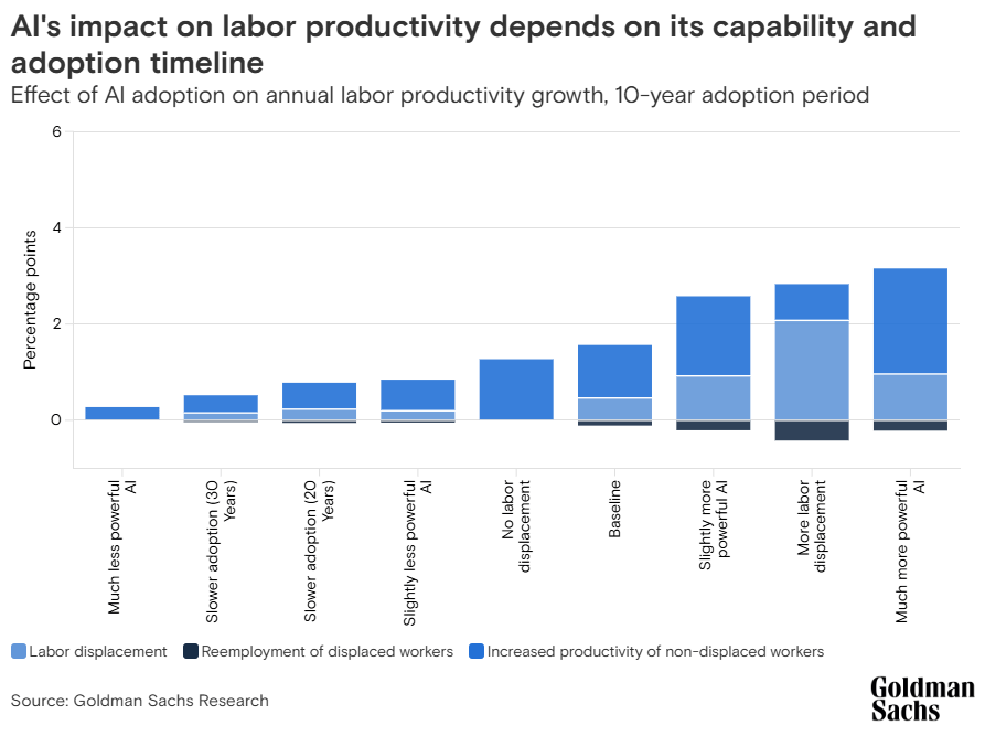 En un artículo de investigación titulado «Los efectos potencialmente significativos de la inteligencia artificial en el crecimiento económico», los analistas de Goldman Sachs, Joseph Briggs y Devesh Kodnani, sostienen que «la adopción de la IA podría impulsar un aumento del 7%, o casi 7 billones de dólares, en el Producto Interno Bruto (PIB) mundial anual durante un período de 10 años».