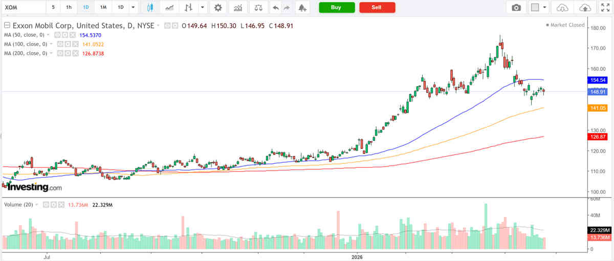 Técnicamente, ExxonMobil también parece vulnerable a un retroceso. Tras una sólida racha, las acciones se encuentran sobrevaloradas en relación con las medias móviles clave y las bases anteriores, cotizando en torno a los 149 dólares. El RSI se sitúa en un discreto 45,13, lo que apunta a un impulso en declive, y la rentabilidad mensual reciente es de un marcado -10%.