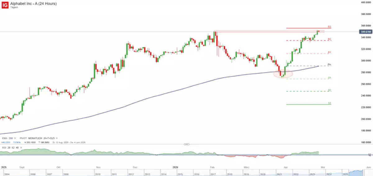 Alphabet publicará sus resultados del primer trimestre de 2026 el 29 de abril. La conferencia será a las 22:30 horas en Europa Central. Antes de la publicación, la acción de Google cotiza cerca de la resistencia clave de 349 a 350 dólares.