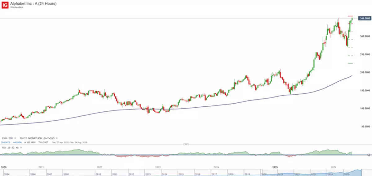 La acción de Google llega fuerte a los resultados, apoyada por el RSI, la media de 200 días y una estacionalidad favorable. La zona de 350 dólares será el punto decisivo.