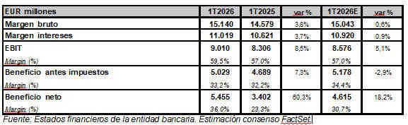 De esta forma, el beneficio neto atribuido a la dominante en 1T2026 registró un nuevo récord de EUR 5.455 millones, frente a los EUR 3.402 millones en el 1T2025, lo que supone un incremento interanual del 60,3% (+18,2%; consenso FactSet), por la buena evolución de los ingresos, la mejora en costes e impulsado por la plusvalía mencionada anteriormente.