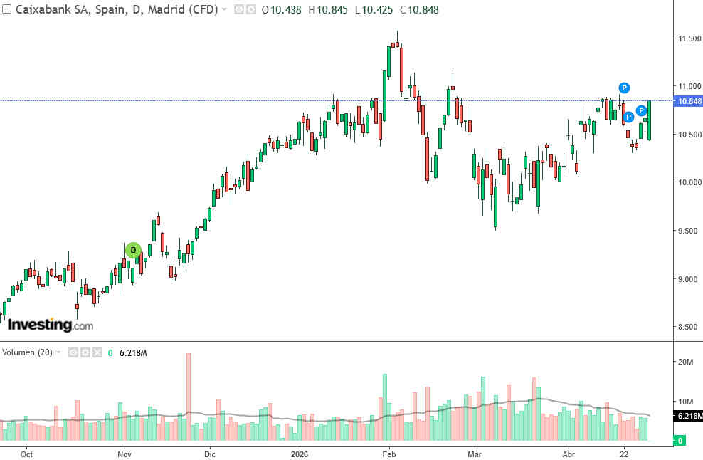 Las acciones de CaixaBank (CAI:MC) suben más de un 1% tras la presentación de unos resultados del primer trimestre de 2026 que, en líneas generales, han sido positivos.
