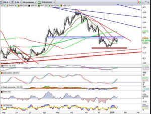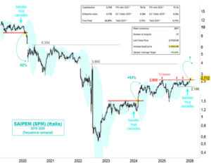 La italiana de servicios petroleros Saipem rompe esta semana la zona de 2,60 euros, resistencia desde enero del año pasado. La ruptura se produce en una situación técnica especial, con sus bandas de fluctuación anómalamente cerradas, siendo frecuentemente la antesala de movimientos de mayor intensidad en el sentido de la ruptura. La zona de mínimos […]