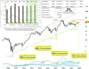 La alemana DHL rompía ayer un nivel de resistencia de dos años y medio, despejando su camino hacia los máximos históricos de septiembre de 2021 en 50,80 euros. Los indicadores lentos, nobles, inician con esta ruptura su cuarta fase alcista de largo plazo, al abrigo de estimaciones crecientes en sus principales variables y márgenes de […]