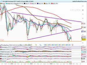 ENCE Velas mensuales. Valor el cual pierde el canal de l/p y cuyo precio actual se encuentra testeando los niveles de la zona de soporte situada sobre los 2,20€, por donde pasa SMA200. Siguiente soporte: los 1,50€. Resistencia, 2,75€, banda inferior del canal de l/p. CELLNEX Velas semanales. Finalmente, ha conseguido alcanzar la siguiente zona […]