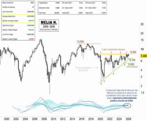 En las últimas sesiones Melia Hotels (MEL:MC), se resiente un 10% desde zonas próximas a 8,25 euros, punto donde se originaron las caídas de 2020 y que años después ha representado resistencia en tres ocasiones. Desde el año 2022, los rangos de fluctuación son anómalamente bajos, acotándose actualmente entre la citada resistencia y el paso […]