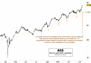 En el gráfico inferior, actualizado del último boletín técnico mensual, se aprecia la sostenida tendencia alcista de ACS desde los mínimos de 2020, con soporte principal en el paso de la directriz alcista desde entonces, actualmente transcurriendo por niveles de 49-50 euros. Los indicadores lentos, mensuales, sugieren que, pese a la aparición de meses correctivos, […]
