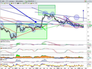 AUDAX Trata de superar directriz bajista corto, siendo esta techo del expansivo marcado como final de onda C dentro de una onda II. Como llevo comentando estos meses, me espero alzas en el valor, entrando en breves en nueva fase alcista medio plazo en forma onda III, pero para ello debe de confirmar movimientos. Todo […]