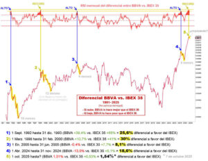 En el gráfico inferior estudiamos el relativo entre el BBVA y el índice español, resaltando una situación excedida en sus indicadores mensuales. Desde el año 1991, sólo en cinco ocasiones se han visto lecturas tan elevadas, siendo la actual muy similar al máximo exceso que se produjo en el año 1998. Se puede comprobar cómo, […]