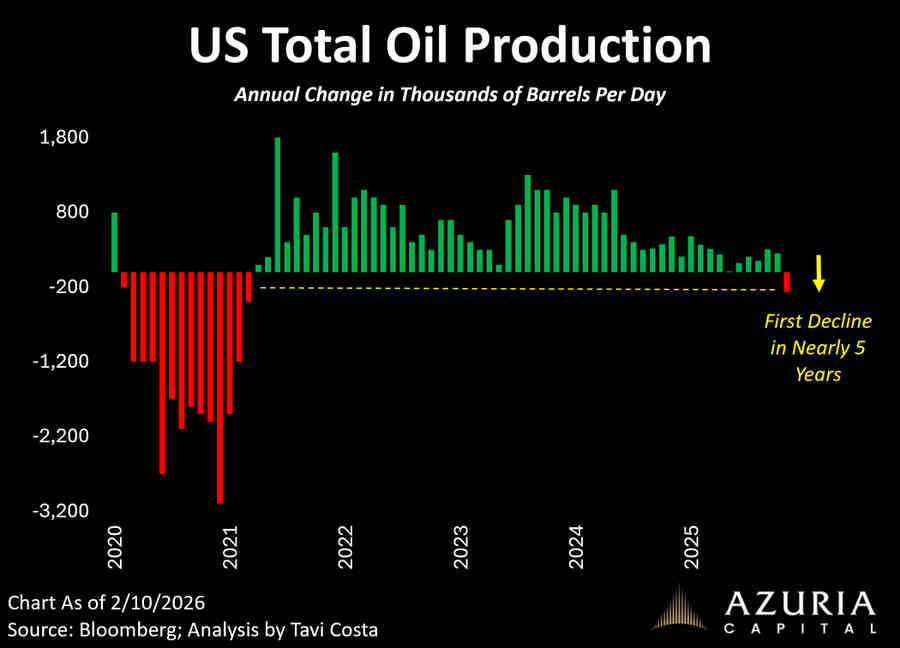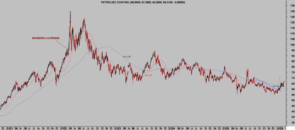 La preocupación inicial por el impacto de la guerra sobre el crudo, disrupciones y caída en el suministro global de crudo fue breve, el West Texas cotizaba en la zona $95 por barril justo antes de aquella invasión que causó un repunte vertical y nervioso de los precios hasta $129 pero poco después fue corregido y desde entonces ha continuado cayendo hasta alcanzar zona de suelo en el entorno de los $55 en abril, mayo y diciembre de 2025.