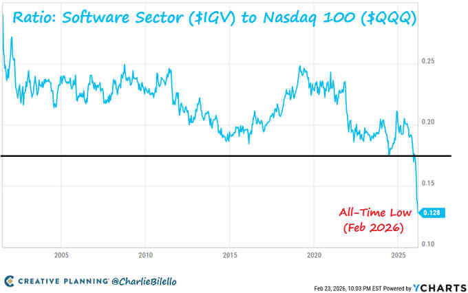 La relación entre el sector de software y el Nasdaq 100 ha alcanzado niveles mínimos históricos,
