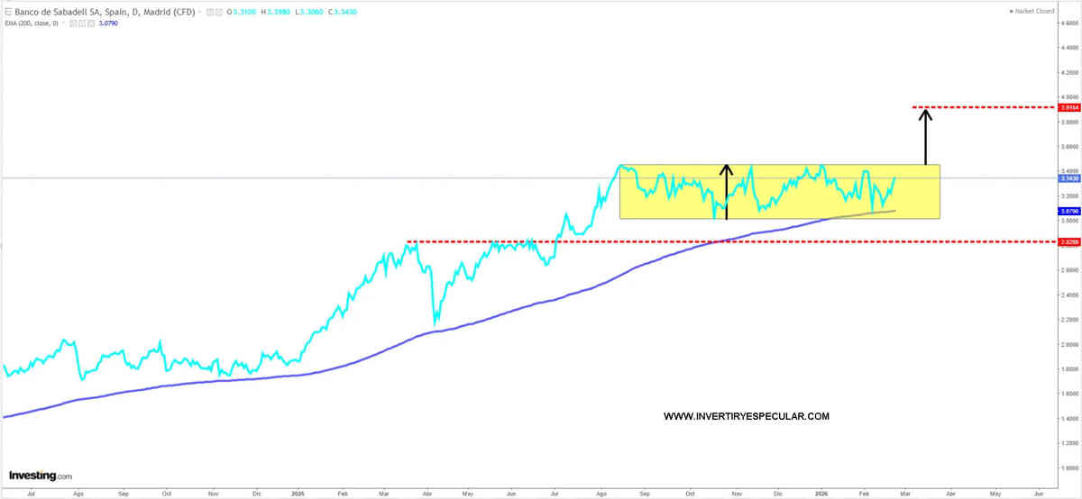 Para nosotros lo que demuestra el Sabadell (SAB:MC) es por el momento lateralidad de la buena, de la que consume tiempo y no profundidad para consolidar tramos alcistas precedentes, si no se accidenta el Ibex por una corrección generalizada el próximo hito para la acción sería atacar los 4 euros que es la altura de su actual rango técnico.