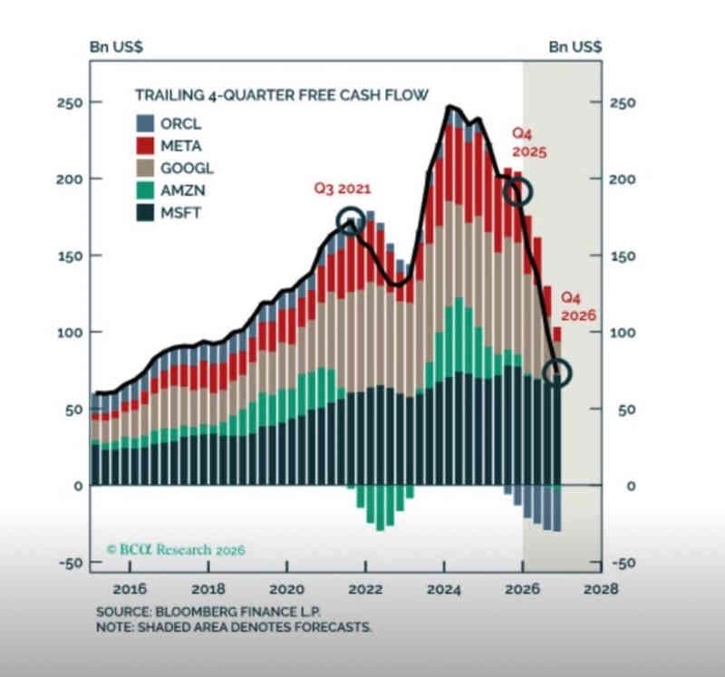 Los esfuerzos titánicos de las empresas por invertir en IA, Capex disparados, tienen como consecuencia, una de ellas, presionar los niveles de «free cash flow» de las compañías a la baja. Las grandes tecnológicas están desplegando una inversiones para fabricar/comprar chips, construir data centers o aumentar la generación de energía un unos volúmenes acongojantes pero sin todavía tener apenas visibilidad sobre el retorno real de esas inversiones, ni siquiera en el corto plazo.